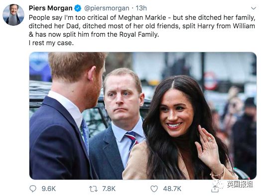 以经常抨击梅根行为举止的英国记者Piers Morgan为例,听闻消息后,他在自己的推上说:“人们说我对梅根太苛刻了,但她抛弃了自己的家庭、亲爹、许多老友,让哈里和威廉反目,现在又让他和王室家族做切割。我还能说啥?”