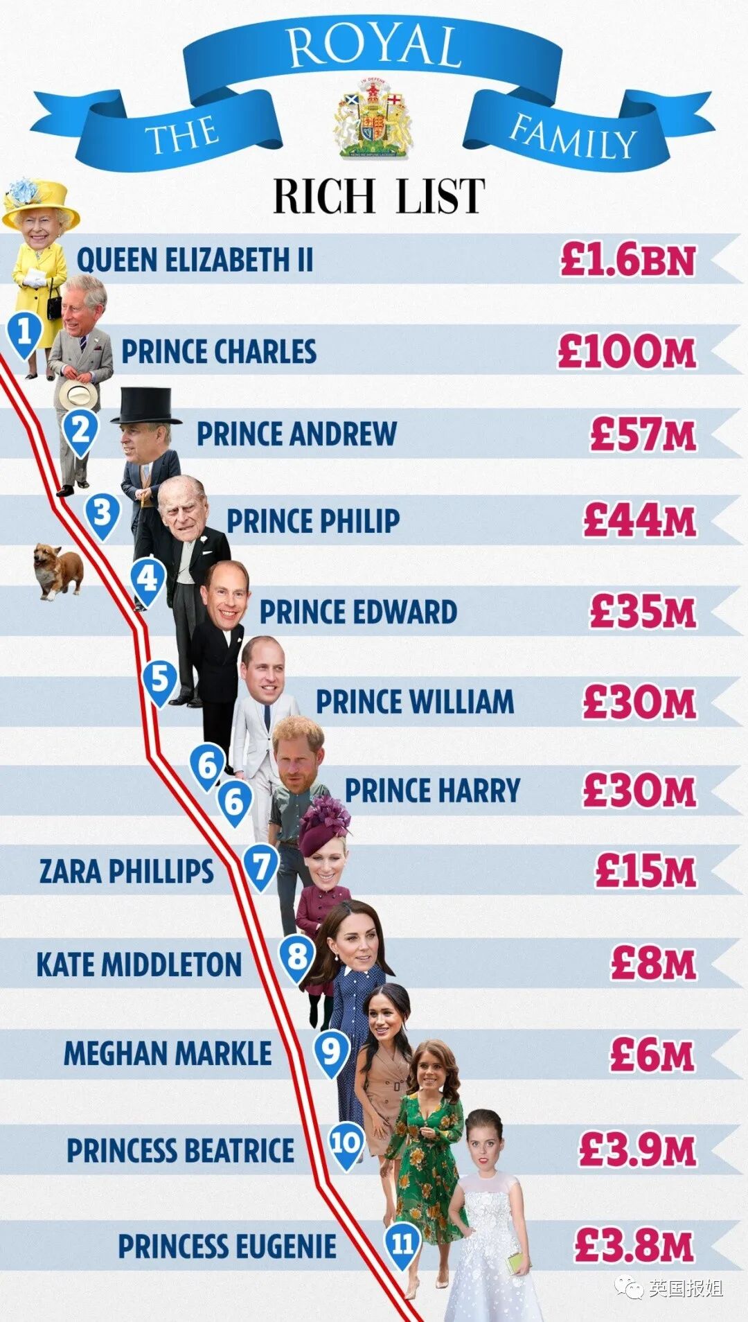 皇室成员的财富排名,这里也可以看出之前哈里举例的彼得根本没姓名