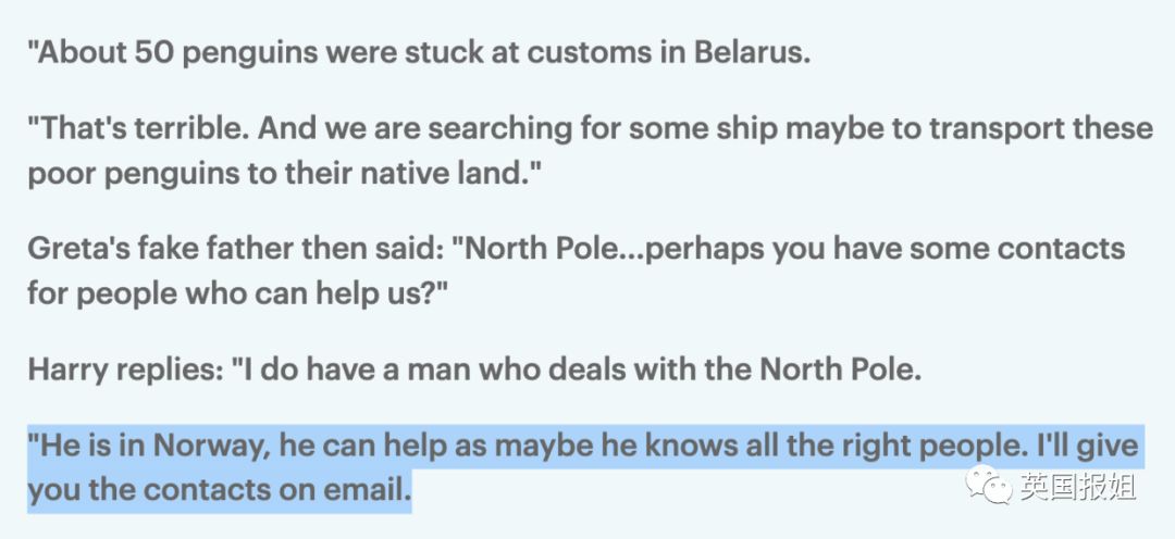 假环保少女编了个漏洞百出的故事:有50只企鹅被困在了白俄罗斯海关。她打算用船把企鹅接回它们的家乡——北极。于是管哈里王子借船。