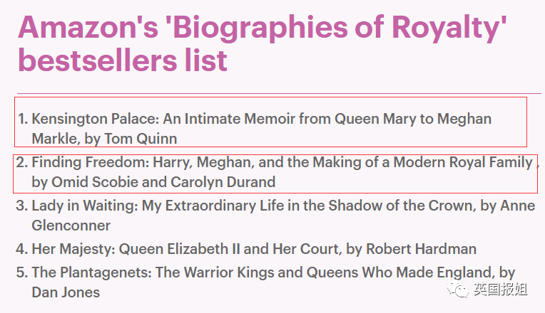 更值得玩味的是,这本书在亚马逊畅销书传记榜排第二,排第一的则是一本王室侍者爆料梅根哈里和其他王室的书。这俩真的是全英顶流了...