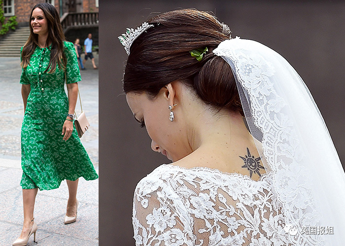 她可以穿着休闲服一家人散步,也可以在参加晚宴和婚礼时,留藏着叛逆的小心机——v字开口的露背装后,正好露出苏菲亚颈上的太阳纹身。