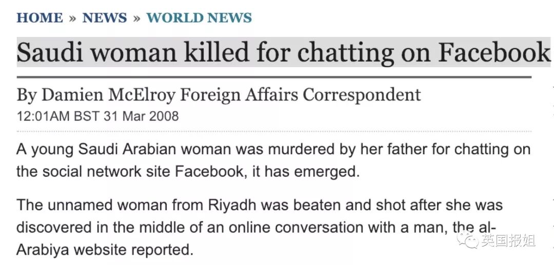 这都是为了家族的“名誉”。比如2008年曾经有新闻:沙特父亲因为自己女儿与陌生男子facebook聊天,就把女儿杀害了。