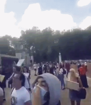 愤怒的人群喊着口号,冲向王宫,在王宫的大门口谩骂着,高喊着...
