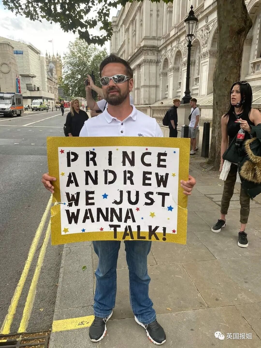 在录像中,一些抗议者似乎挥舞着标有安德鲁王子的横幅。一些标语谴责着安德鲁与爱泼斯坦的丑恶勾当。