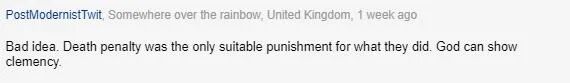 “真是个糟糕的主意。针对他们的所作所为,死刑是唯一合适的惩罚。上帝会宽恕他们的。”