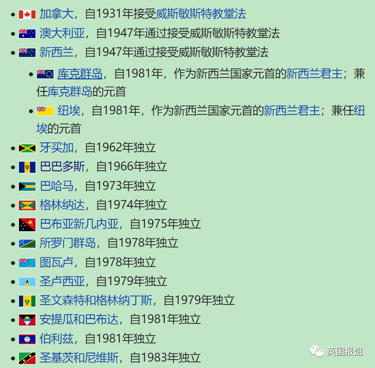 但英联邦共主王国,就是在主权独立的基础上,继续承认英国君主为国家元首。女王和王室时不时回去视察一下,度个假。人们家里还是会放女王的画像,甚至每周上学要对女王的画像宣誓。