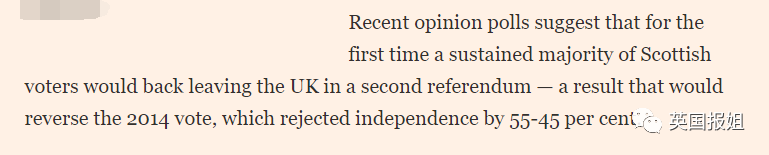 《金融时报》报道,9月的民调资料显示,苏格兰选民在独立问题上,首次支持者大于了反对者,这很可能会扭转2014年那场对45%支持对55%反对的局面。