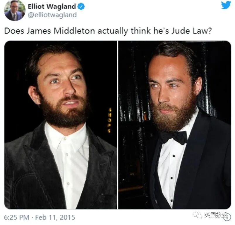 James Middleton因为和裘德洛相似的长相,一度被英国媒体誉为王室黄金单身汉。