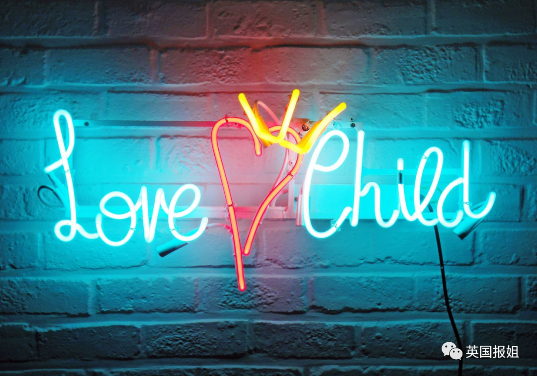 霓虹灯雕塑,上面的“Love Child”(爱、孩子)两个单词中间被一颗红心隔开,红心上方是黄色的王冠。