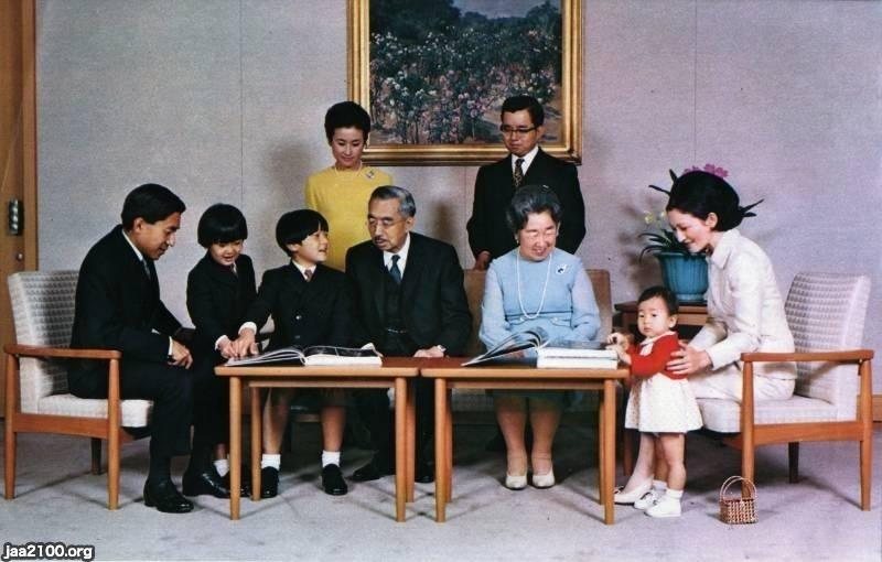 昭和天皇全家福,最左为明仁与儿子文仁、德仁,最右为妻子良子和女儿清子,后为弟弟正仁与妻子
