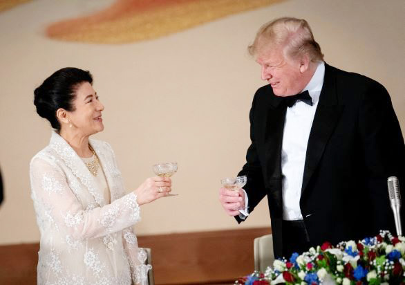 雅子活力满满地出现在各国外宾的接待会上,她可曾是个外交官啊!接待川普参加晚宴时,雅子得体优雅又妙语连珠,惊艳众人。
