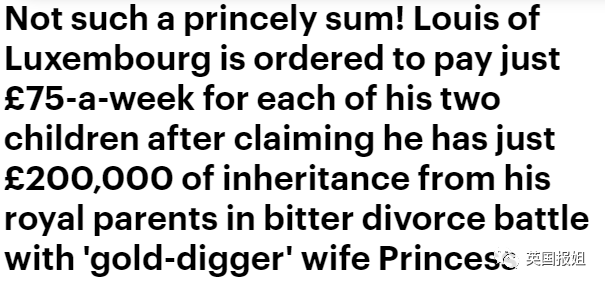 路易斯,欧洲王子,每周将向他的两个儿子每人支付75英镑。每个孩子每年付4000英镑(约为3.5万人民币)。这个还是法院判的,路易斯本来只想付3000磅。另外他还应向泰西和孩子们颁发“居住在伦敦的旧居所的许可证”,直到最小的孩子完成学业为止。