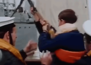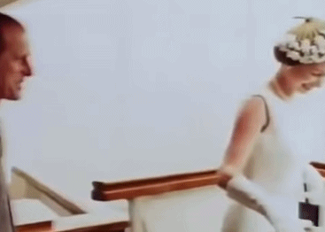女王在船上也要处理公文,而大孩子们已经找到了新乐趣。查尔斯被吊在绳索上,从一艘船滑到另一艘船。稍微一不小心就会掉到海里,看样子他也挺紧张的。