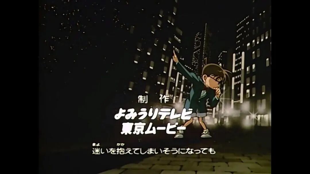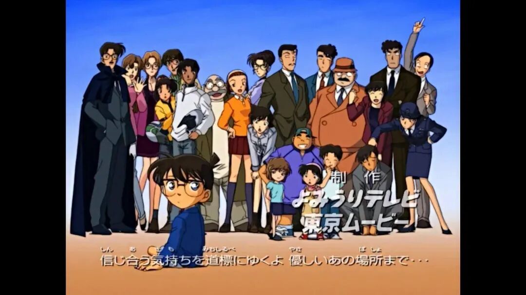 那么,OP中通常以怎样的方式表现人物呢?主要通过OP正片的故事展开以及OP结尾处的全家福进行展现(所谓全家福,就是在OP结尾处,以“全家福”的形式将柯南中的一些主要人物容纳于一个画面中,进行收尾)除此之外,许多OP还有其特殊之处来进行人物的表现,接下来我们将选取一些具有特点的OP进行介绍~