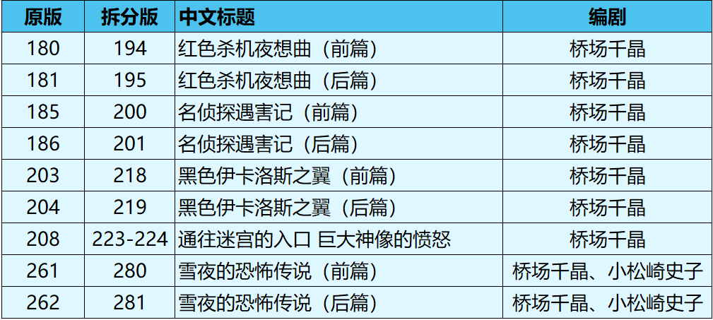 与於地纮仁类似,桥场千晶同样属于量少而质精的编剧,因此桥场老师笔下的案件全部值得一看。其所创作的剧本如下表所示: