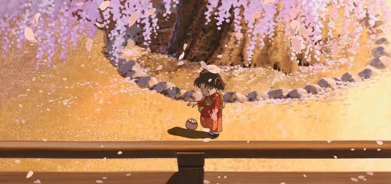 她穿着美丽的和服,在樱花树下一遍又一遍唱着歌,拍着皮球。