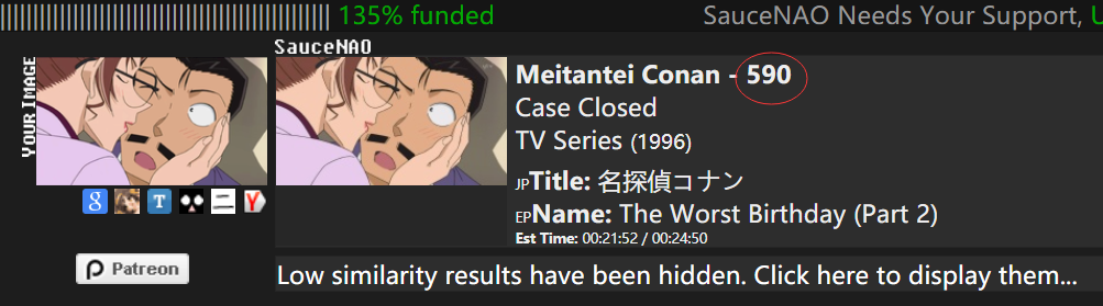 国外著名的识图网站SauceNao,其图片识别功能识别后所标注的集号为原版集数(下图红圈处)。