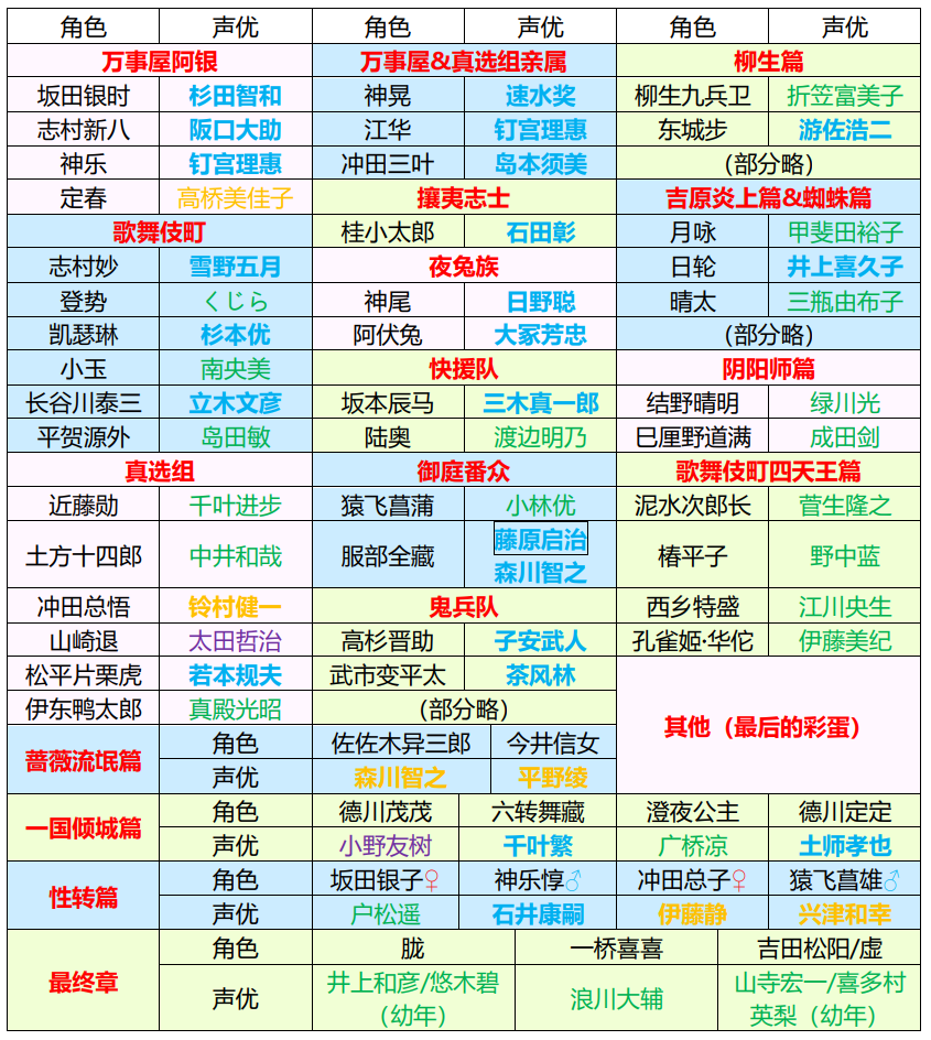 首先让我们看看《银魂》的主要角色声优(部分声优交替的我们忽略):