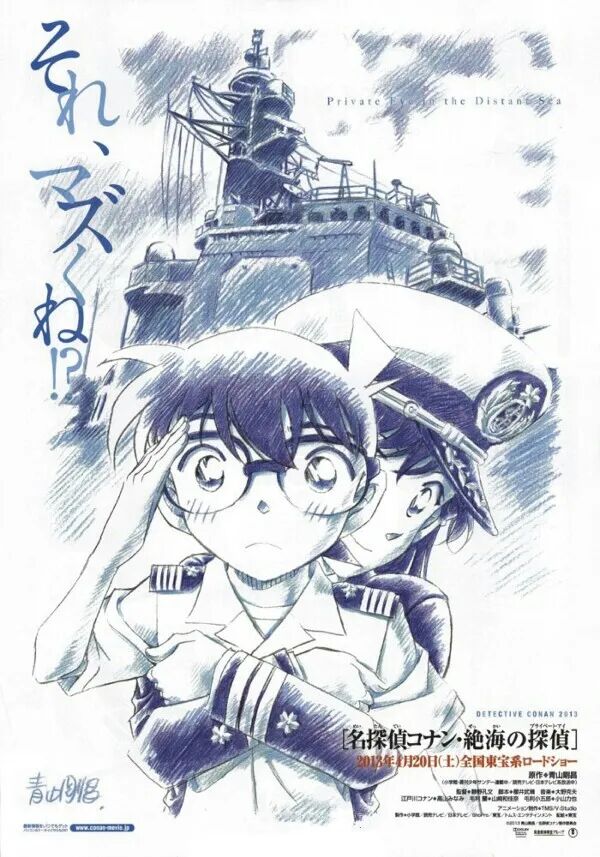 剧场版17《绝海的侦探》的手绘手绘有三个直观的元素:深蓝色的手绘色调,身着海上自卫队服装的柯南和小兰,以及他们身后宙斯盾舰船舷的实景图。