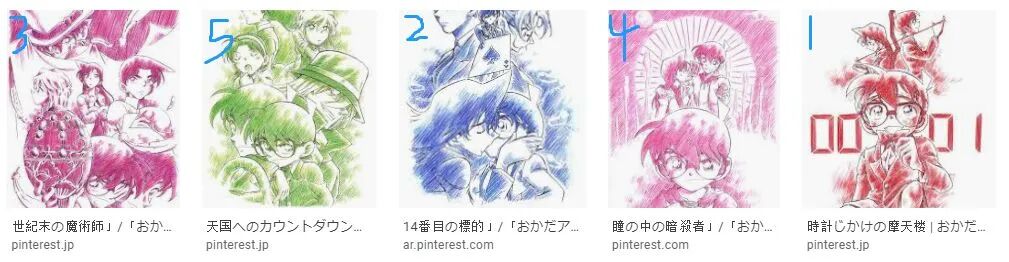 此外,剧场版1-5青山老师没有手绘海报,但是有一位同人画家“おかだアンミツ(T-okada)”自行手绘了前5部剧场版的海报,而且画风和青山老师相似度很高,以至于被不少柯迷误认为是官方海报(但是不得不说,画的场面都非常经典而且很好看2333)。
