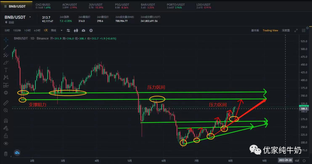 前期社区一直在推荐OKB,BNB做定投,最近一段时间都是带着大家在做热点个币,确实疏忽了BNB的行情,加上最近BNB的利好,走势上还是不错了,前期跟着埋伏的兄弟们或者定投的兄弟们,现在都能看到成效,从图中日线表示很明确,跟随大盘的走的同时,现在上方还有一定的空间,340第一道防线阻力,360第二道防线阻力,这是前期的支撑点位,也是目前的阻力压力位,大家在这个区间可以进行一定的减持,等待结束减持之后,回落下来再去选择进场或者定投,这是明智的选择。