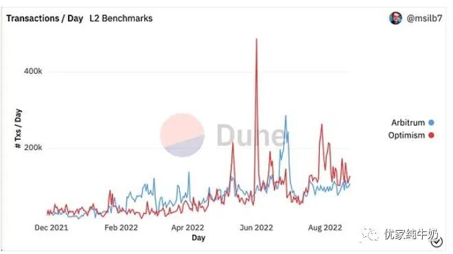 较低的成本也刺激了第二层网络上的活动,2022 年初,Optimism 每天处理约 3 万笔交易,现在每天约 10 万笔。我们也观察到了每日活跃地址数量的快速增长,自 2022 年开始上升了约三倍,达到约 10000 个。