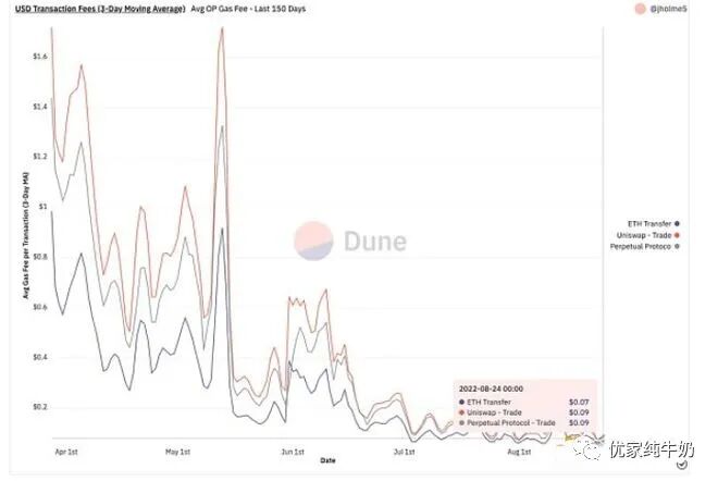下图显示了这一做法的实际效果,随着采用的进展,交易越来越便宜。目前,ETH 转账以及 Uniswap v3 或 Perp v2 上的交易成本低于 0.10 美元。Optimism 上的 gas 成本比主网便宜了 3 到 30 倍,尽管这取决于交易的复杂性,更复杂的操作可以节省更多的 gas 费用。