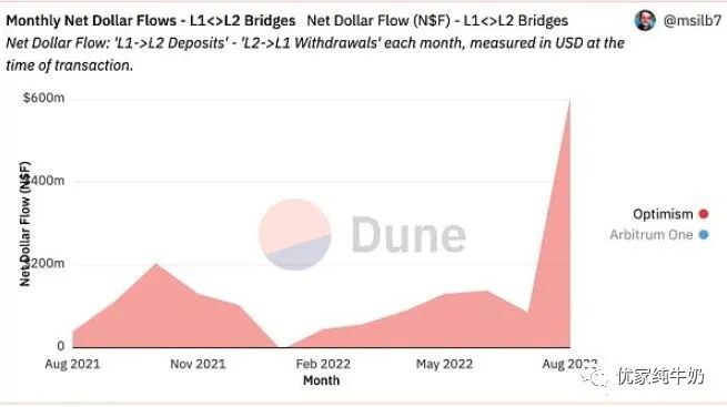 除了活跃地址和交易数量的增加,该网络中最近几个月的月度美元流入量也大幅增长,因为 rollup 获得了更多的吸引力,更多的项目部署到这个第二层网络,以及 OP 夏季奖励。