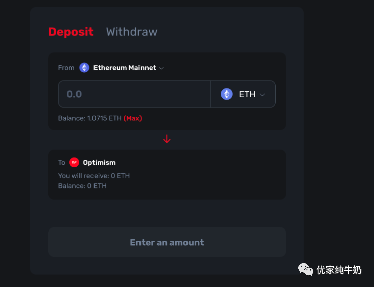 将价值100 美元以上(此金额仅供参考,不代表符合空投资格)的ETH 或者稳定币(USDC、USDT)从以太坊转至Optimism 链上