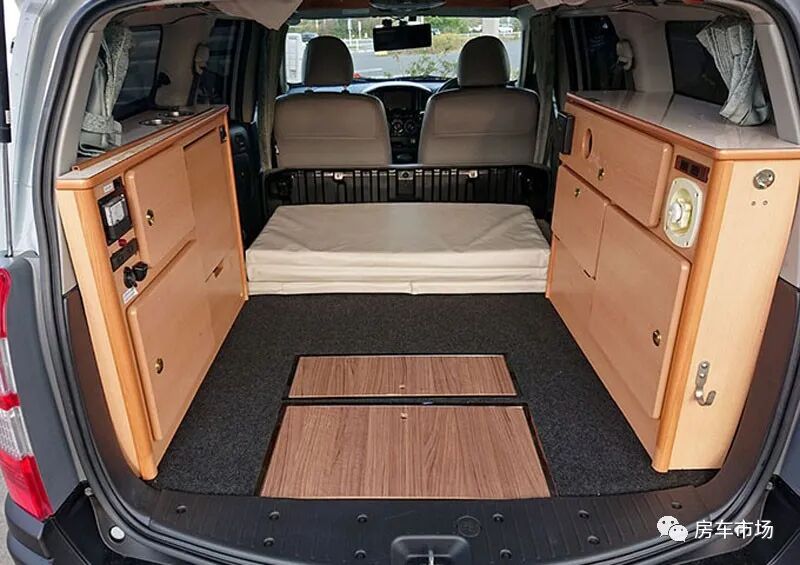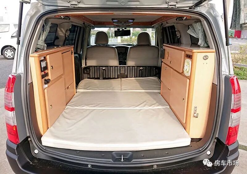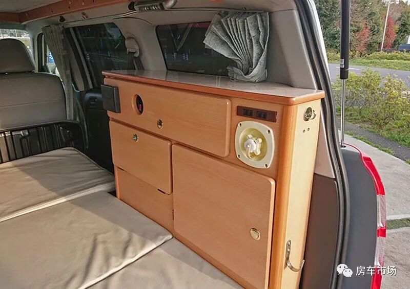 这台休闲旅居的丰田多功能车,可以当作房车来露营,也可以家用代步,内部配置了基本生活起居用品,能简易地做饭休息,适合2-3口家庭使用。