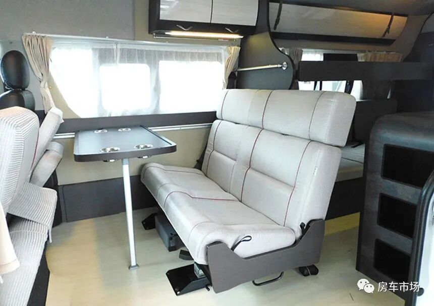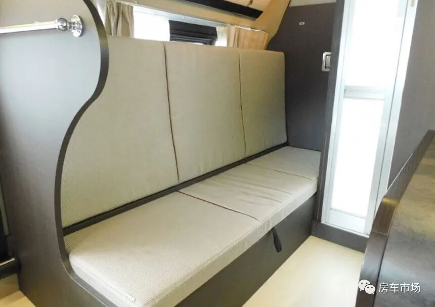 后部纵置上下床平时可以当做沙发使用,翻折后完全看不到上铺床位,在休息的时候把沙发整体靠背整体翻折,两张床位形成,能睡下两名成年人。