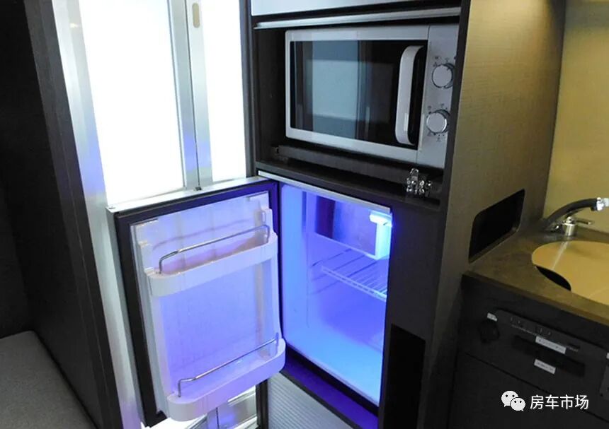 来到厨房区域,橱柜还是比较大的,台面上配有带水龙头的洗菜盆,标配清水箱19升,灰水箱19升,旁边较高的柜子上配有49升车载冰箱和微波炉,做饭比较方便。车内还配有2块100ah电池,逆变器2500w,行车充电、外接电源都齐全。