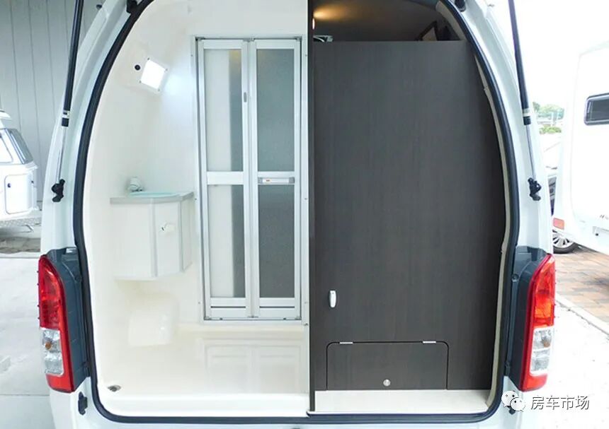 后部是独立的洗漱间,设置在车厢尾部,通过推拉门进入内部,隐私性较好,内部有洗手盆,抽拉式的淋浴花洒,简单冲洗一下,并配有便携式马桶。