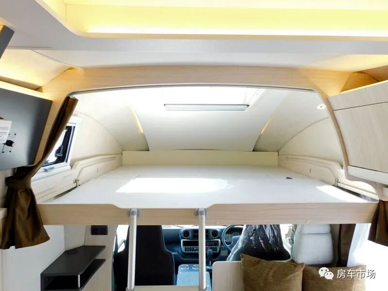车辆头部是可以延伸的大床,使用时将床板拉出,通过爬梯上去,尺寸为1.5*1.8m,能睡下两人。床的上部也就是车顶开有一个大天窗,随时打开通风照明,晚上休息时也能看看美丽星空。