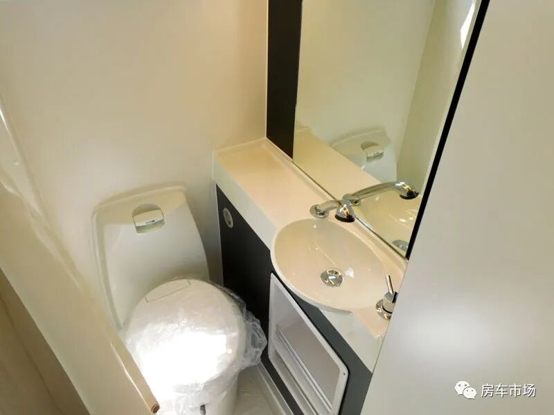 卫生间在车厢的中部,设置了洗手盆,化妆镜,固定盒式马桶,顶部的换气扇,热水来自热水器。