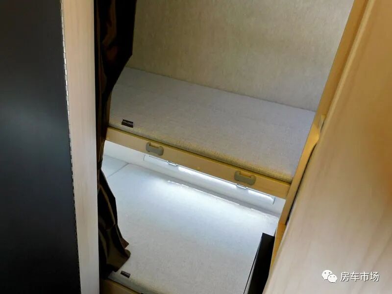 后部设置的是两张单人床,上铺可以翻折,并不占用空间,尺寸为1.8*0.7m,可以睡下两人。全车自带240Ah锂电池,能给车内的家用空调提供足够的电量。