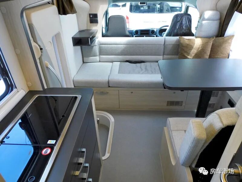 轻卡房车内部空间比较宽敞,内部高度超过2m,前部是会客区,由一组长条沙发和卡座组成,会客区上部设置的是一张额头床,车厢中部是厨房和卫生间区域,尾部是两张横置上下的单人床设计。
