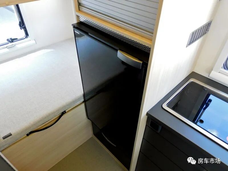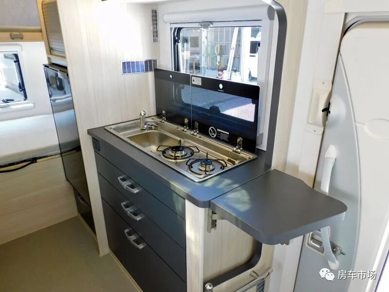 来到厨房区域,橱柜台面为一体式设计,翻起后能看到洗菜盆和双眼燃气灶,顶部还设有一台带LED灯的抽油烟机,台面还做了拓展,增加使用面积,做饭时使用。清水箱80L,灰水箱为80L,橱柜旁边是一台侧开门的85L车载冰箱。