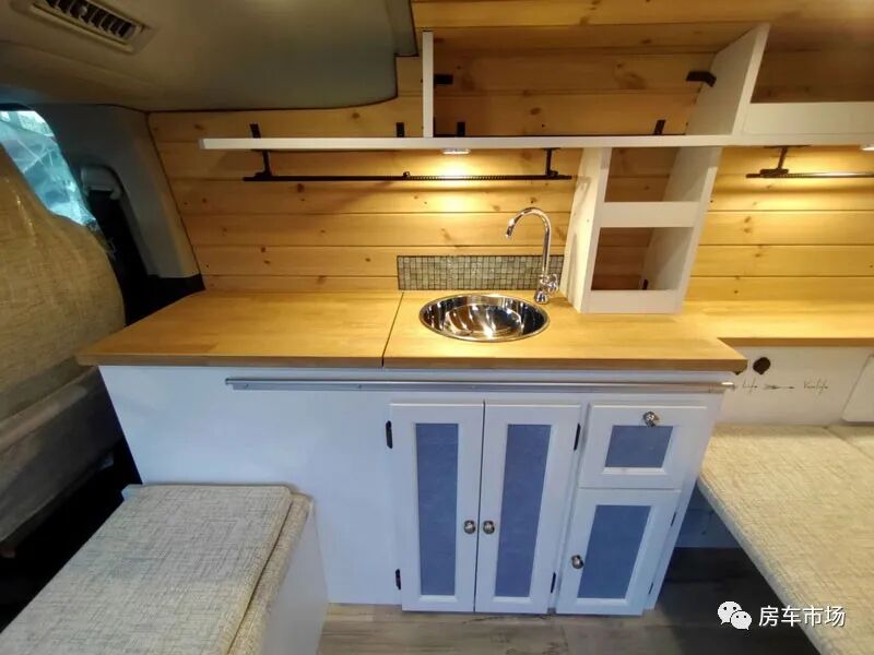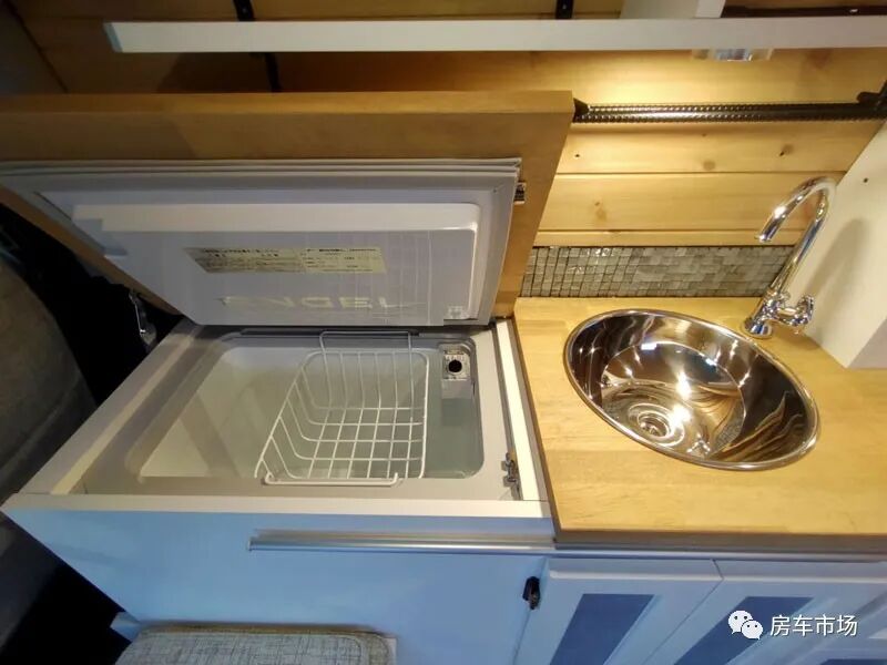 来到厨房区域,面积不大,台面上设置的是带水龙头的洗菜盆,旁边是隐藏式的车载冰箱,台面可以直接掀起,冰箱为12伏40升。橱柜中放置了两个19升的水箱,清水和灰水便于使用。