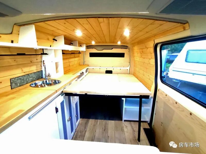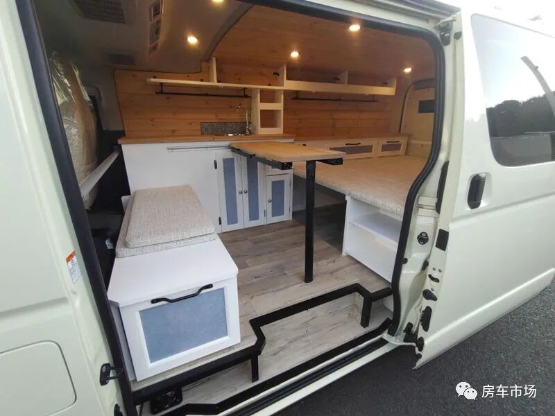 这款由丰田海狮打造的VanLife风格的房车,内装简约时尚,符合年轻人的口味,车内有水电,基本能满足两人旅行使用。