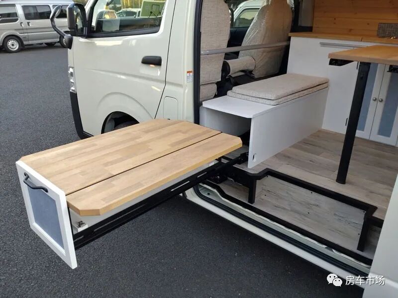 打开侧滑门,门口设置了长条柜,可以当成临时座椅,搭配带腿的桌子和内部床位形成对坐模式,打开长条柜子是一个抽拉式桌台,使用的时候拉出来,在室外放置物品吃饭喝茶,两处可内可外的休闲空间,自由选择。