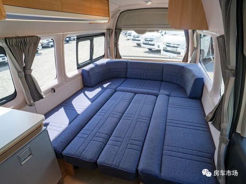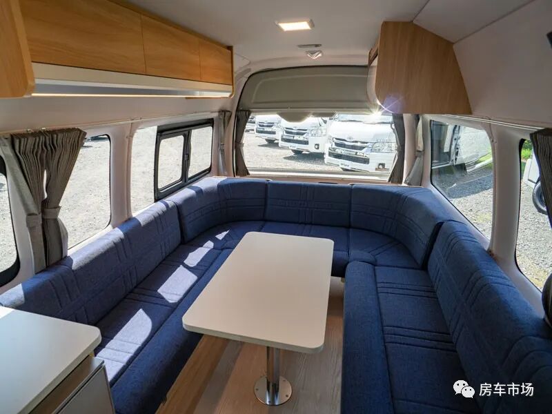 车辆后部整体由U型沙发组成,尺寸较大能坐下5~6人,中间设置了一张可移动餐桌,不用时可以拆卸,休息时可将沙发拼床,尺寸为:1.7m*2.0m,可以睡下3人。