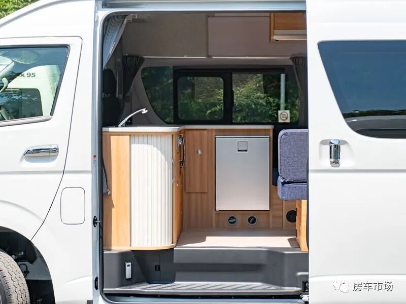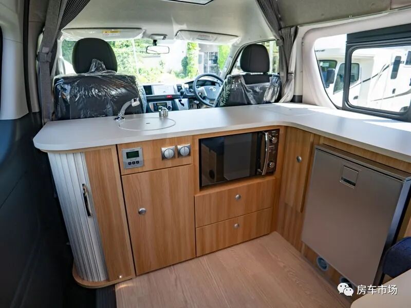 前部的厨房区域配置齐全,橱柜上设有带盖板的洗菜盆,抽拉式水龙头,可以延伸到车外使用,下方设有微波炉、50升车载冰箱。做饭时可以使用便携式卡式炉,方便安全。