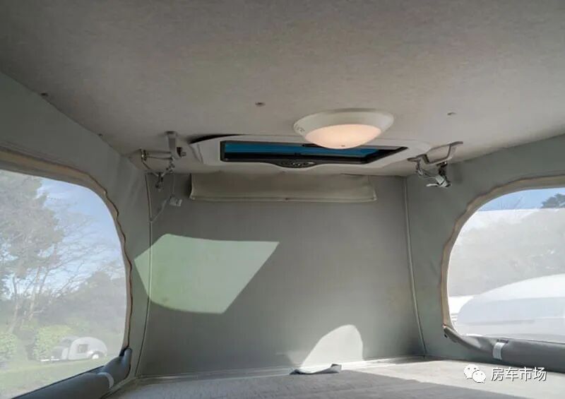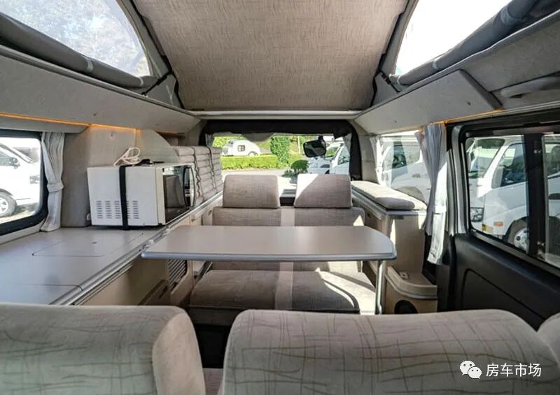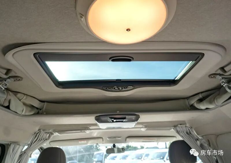 车内空间还是比较宽敞的,车顶可以升顶,内部高度超过2米,这样可以自由在车内活动,两侧都有窗户,车顶也有电动天窗,打开后车内通风照明效果比较好。