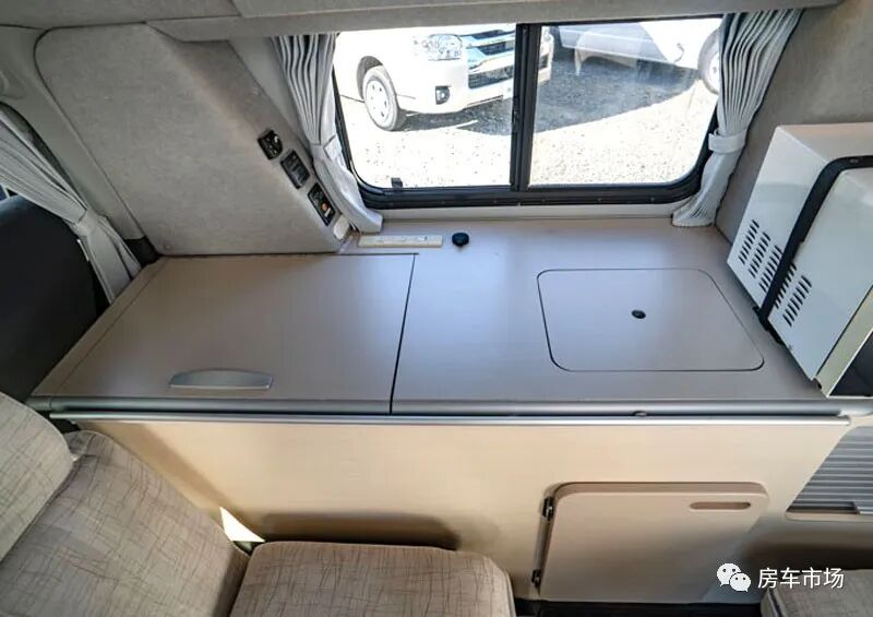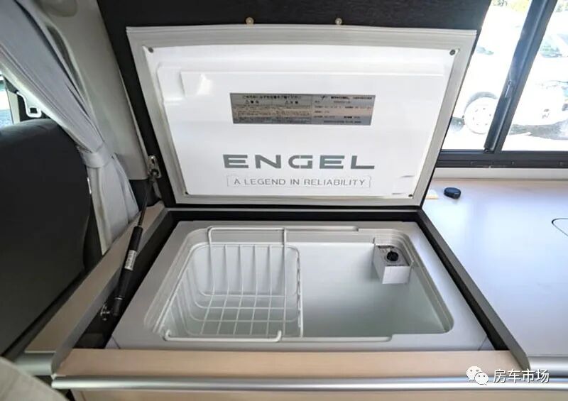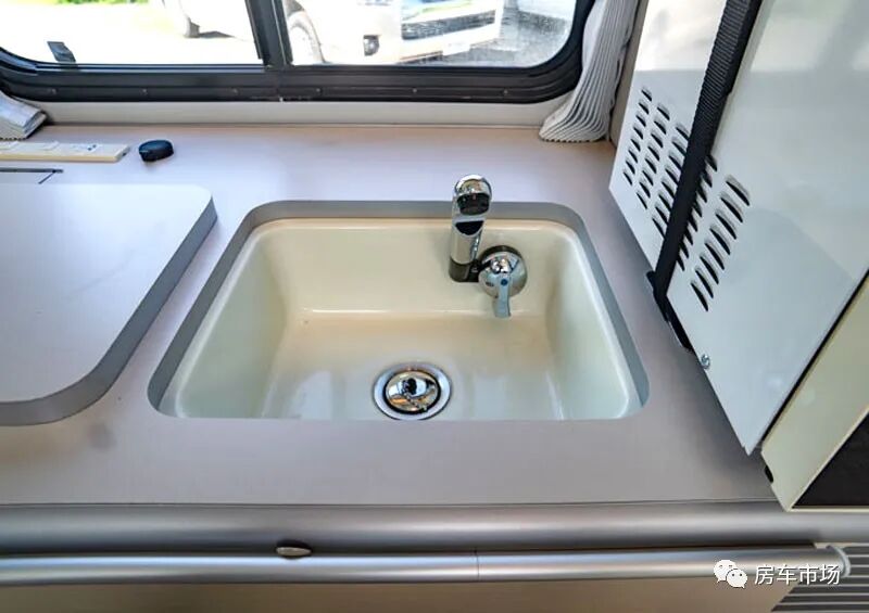 厨房挨着右侧窗户,台面为隐藏式设计,设有冰箱和洗菜盆,冰箱为40升车载翻盖式,做饭使用便携式卡式炉,加热可以使用微波炉。清水箱和灰水箱各10升,和平时见到的塑料桶一样。