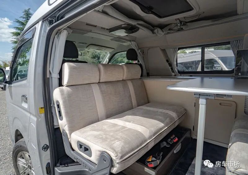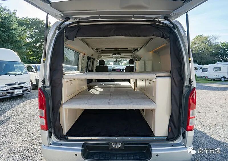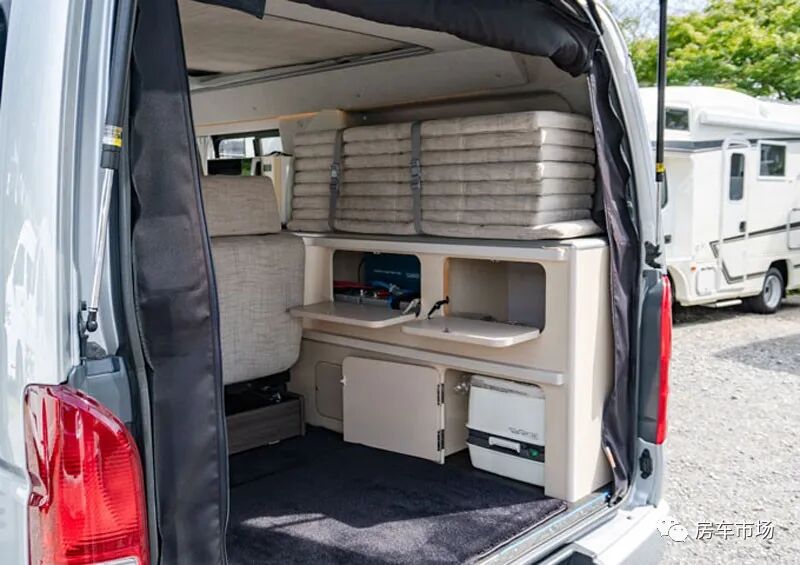 后部空间较大,侧面能放置床垫,储物柜也可以放置不少物品,便携式马桶也能放到里边,使用方便。