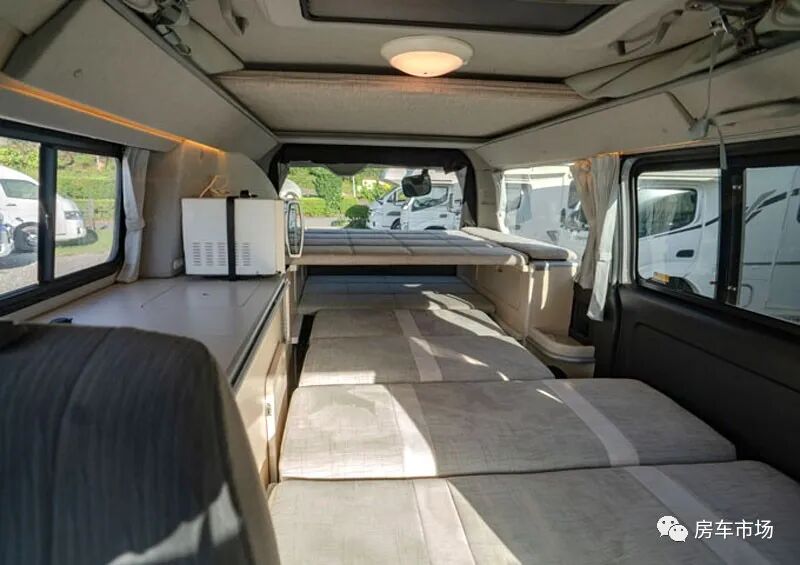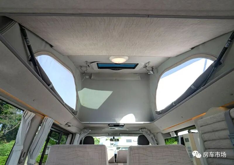原车内部高度只有1.6米左右,通过升顶后车内高度可达2米以上,空间宽敞,上部的升顶部分设有天窗和通风纱网,能睡下两人,可以在上面看风景,通风效果好,夏季在车顶上休息比较理想。