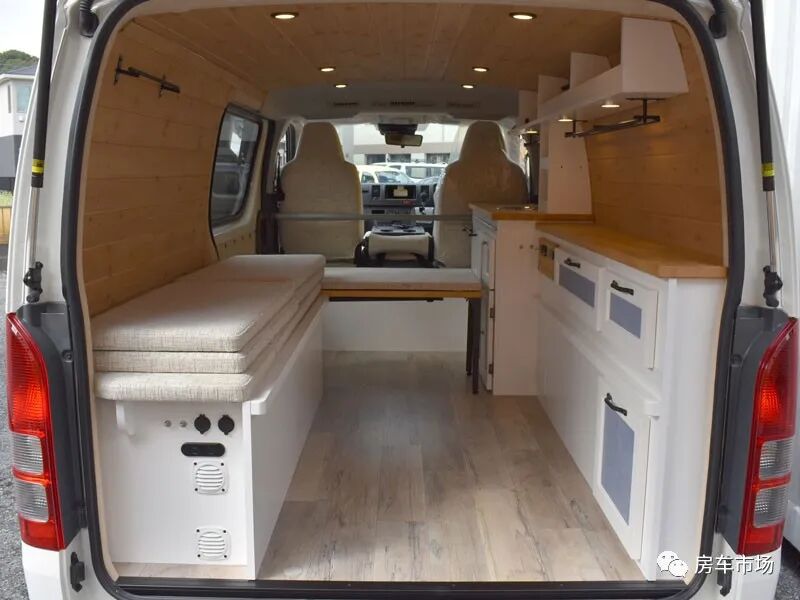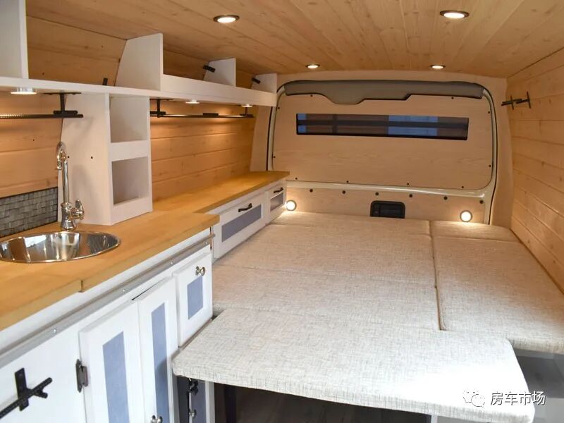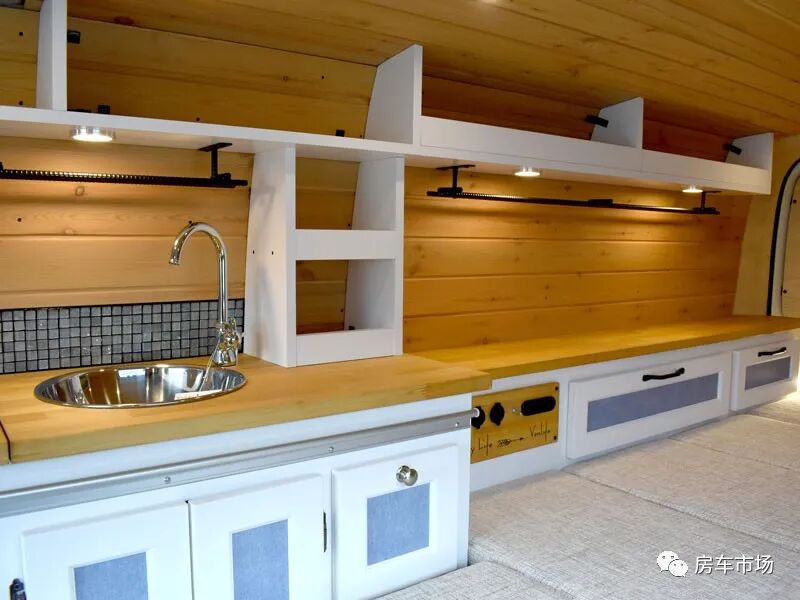 侧面厨房旁边还设置了不少柜子,一直延伸到车尾,都可放置物品,台面和车顶装饰风格一致,原木风格搭配白色漆面框架,清新整洁。