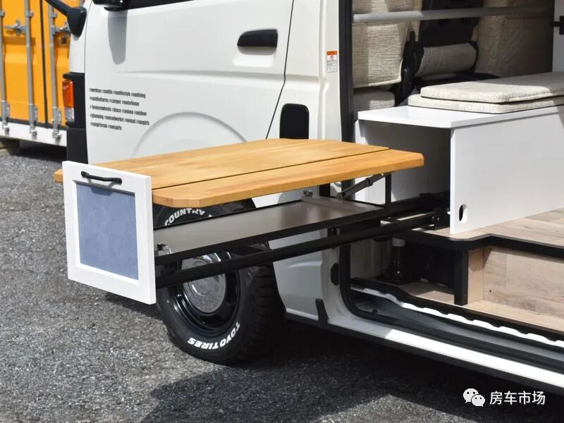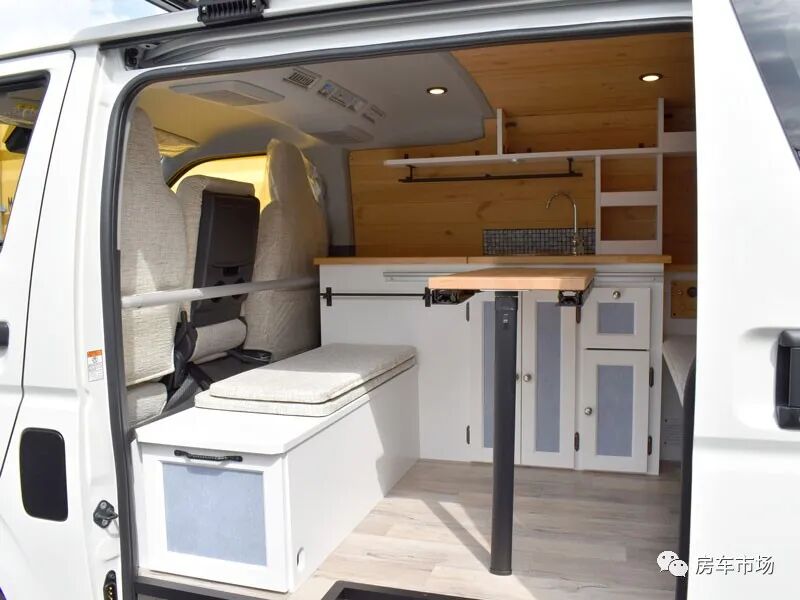 驾驶室为三个座椅,车厢右侧为无门设计,只在左侧开门,可以看到前部的临时座位,后部空间可以自由安排,中间有一张搭在厨房侧壁的活动桌板,吃饭看书都没问题,前排的柜子能当座椅,内部是外置抽拉厨房。