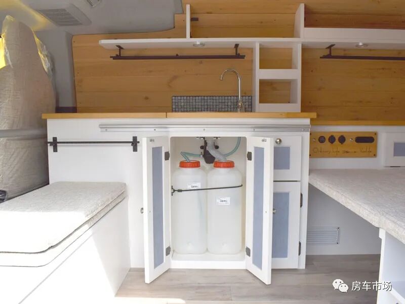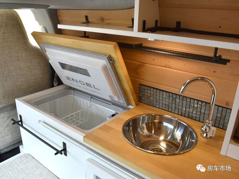 车内的厨房在车厢右侧,橱柜上能看到隐藏式的50升车载冰箱,旁边是不锈钢洗菜盆和水龙头,厨房用水来自橱柜下方的两个15升水箱,简单实用。